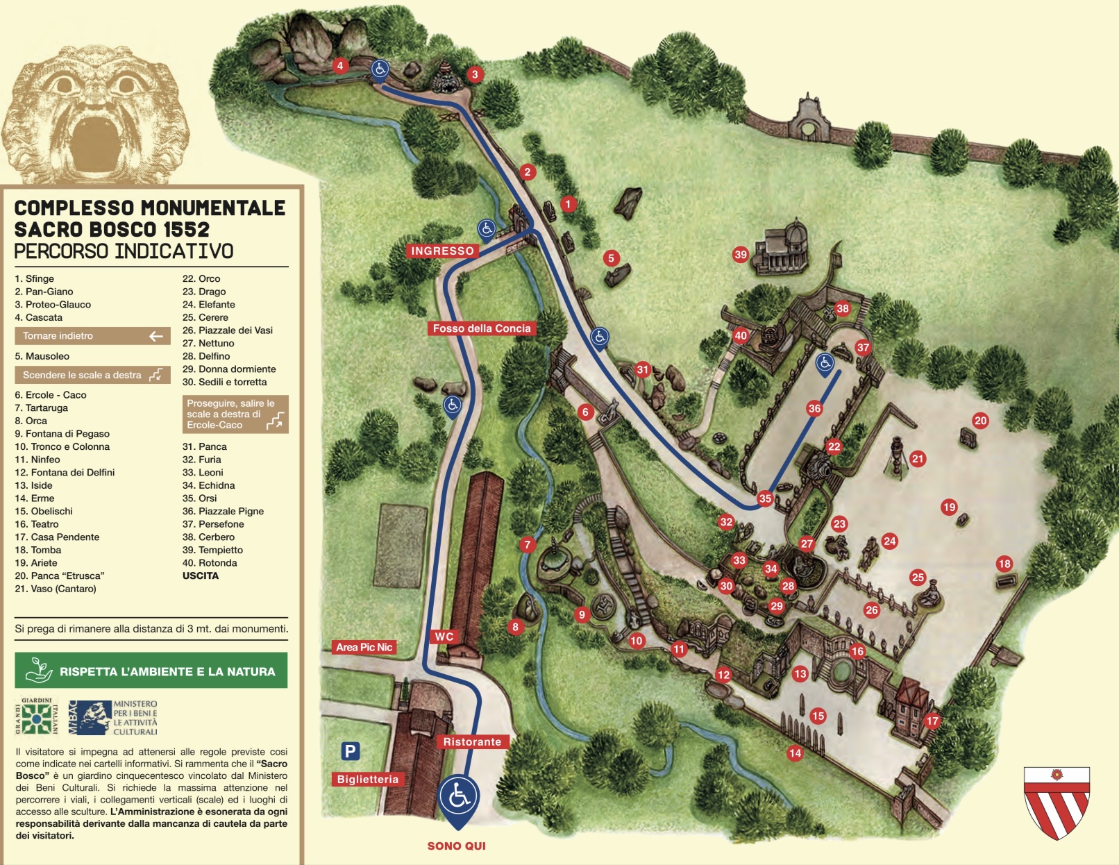 Elementi giganteschi, strutture irrazionali, creature minacciose, oniriche e mitologiche, il tutto è in netta contraddizione rispetto al contesto naturale. Mostri, draghi, dei ed animali, assieme a templi funerari, case pendenti, obelischi e strambe fontane creano un mondo illogico fatto da allusioni ed illusioni irrazionali. Un labirinto di simboli in cui perdersi è molto facile e che tutt'oggi nessuno è ancora riuscito a decifrare.